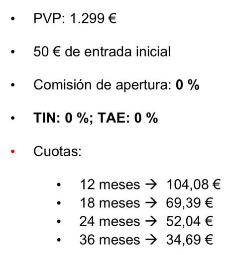 Aprovecha ahora y ahórrate 100€ y financia cómodamente al 0% sin comisiones ni intereses. Además, tú eliges el plazo entre 12, 18, 24 y 36 meses.