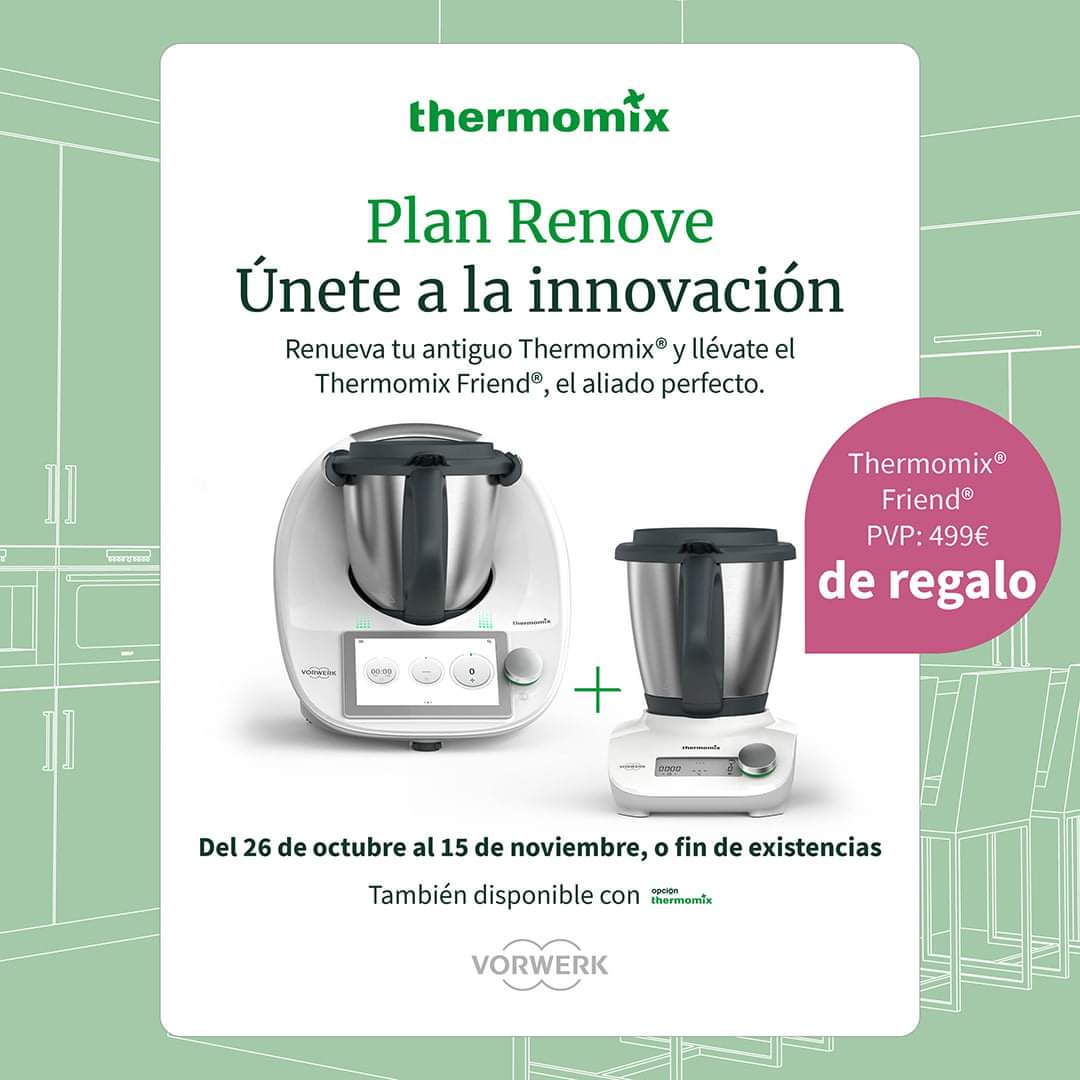Si tienes un modelo antiguo de Thermomix que ya lo ha dado todo, ahora es tu momento con el plan Renove: por la compra de tu Thermomix Tm6, y solo por entregar tu vieja máquina (funcione o no), vas a tener de regalo un Thermomix Friend (valorado en 499€) que no solo te va a ahorrar tiempo en la cocina, podrás hacer varias elaboraciones al mismo tiempo e incluso ¡cocinar para muchos comensales de una vez!