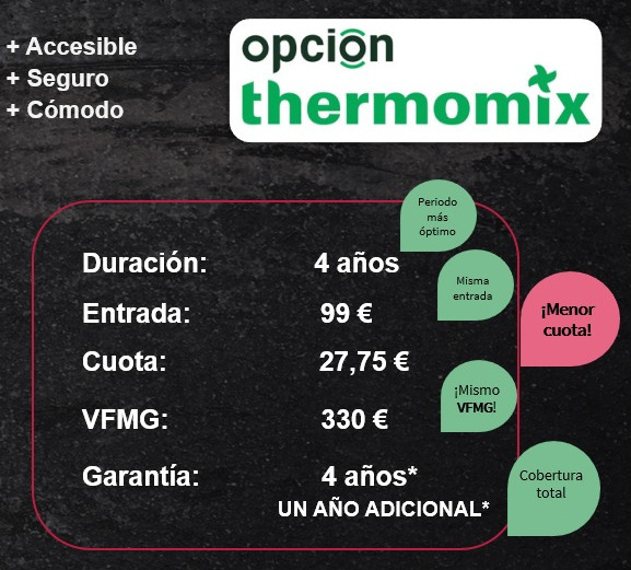 Además, financiando con opción Thermomix, podrás disfrutar de tu Thermomix por solo 27,75 €/mes y tendrás 1 año adicional de garantía (4 años en total).