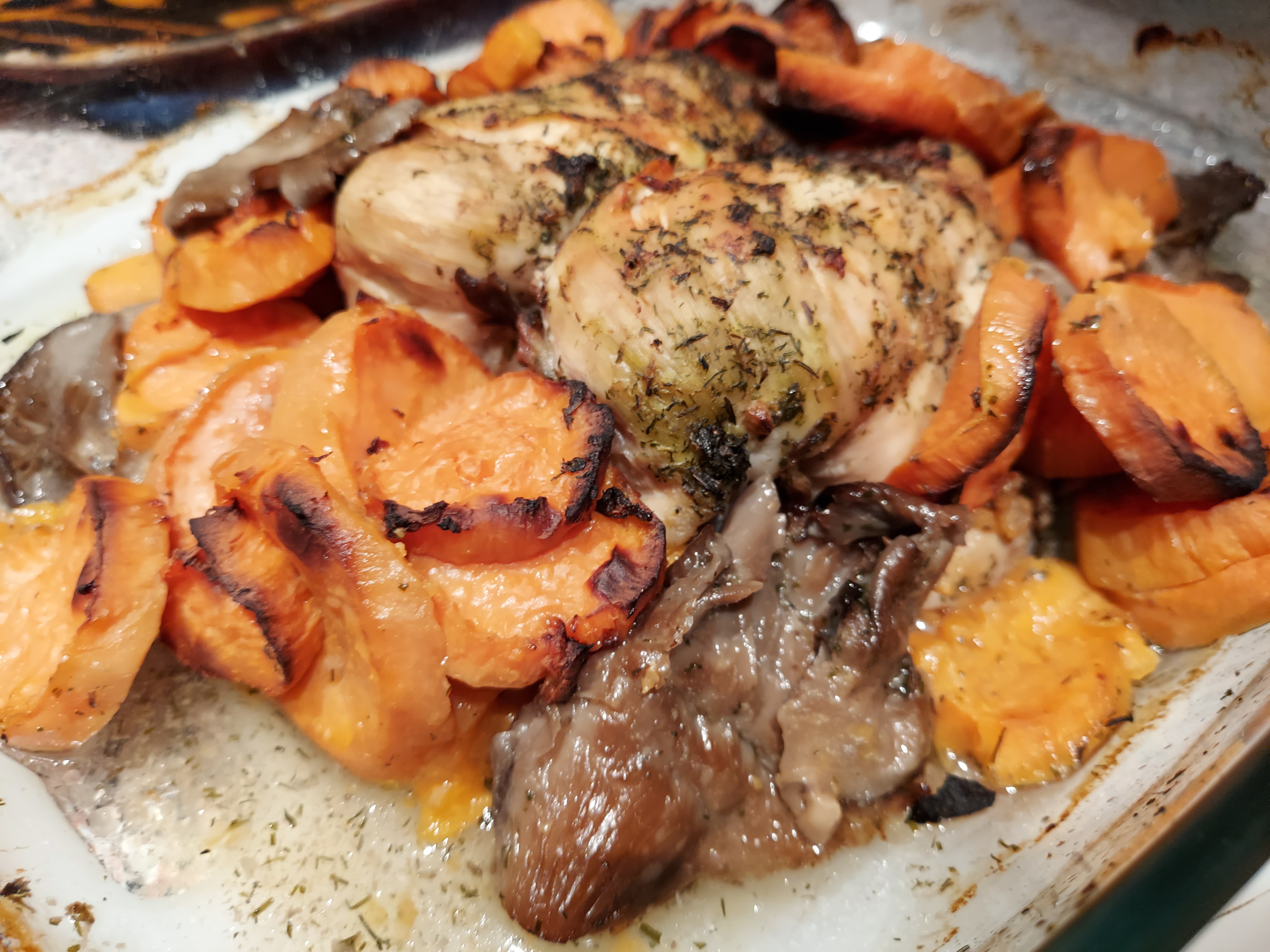 Yo no tenia pavo y lo sustituí por una pechuga de pollo entera, también podemos sustituir la batata por patata, la batata al ser dulce le da a la receta otro sabor más original, las setas podemos sustituirlas por champiñones o cualquier tipo de setas.