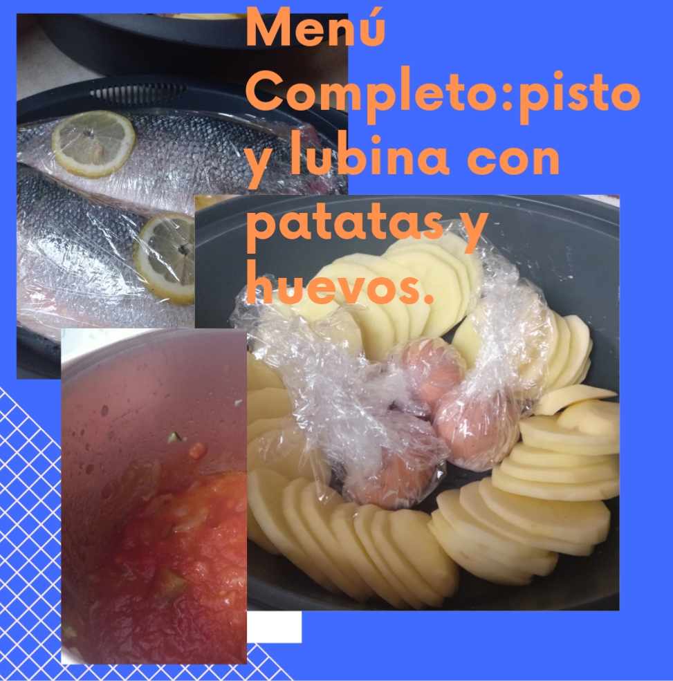 Un menú muy sencillo, rápido, sano, fácil, versátil....en el vaso de nuestro Thermomix vamos a cocinar el pisto, en el varoma hemos colocado las patatas cortadas en rodajas y envuelto los huevos para que no contaminen el resto de la comida y en nuestra bandeja del varoma las lubinas envueltas y sazonadas a nuestro gusto.