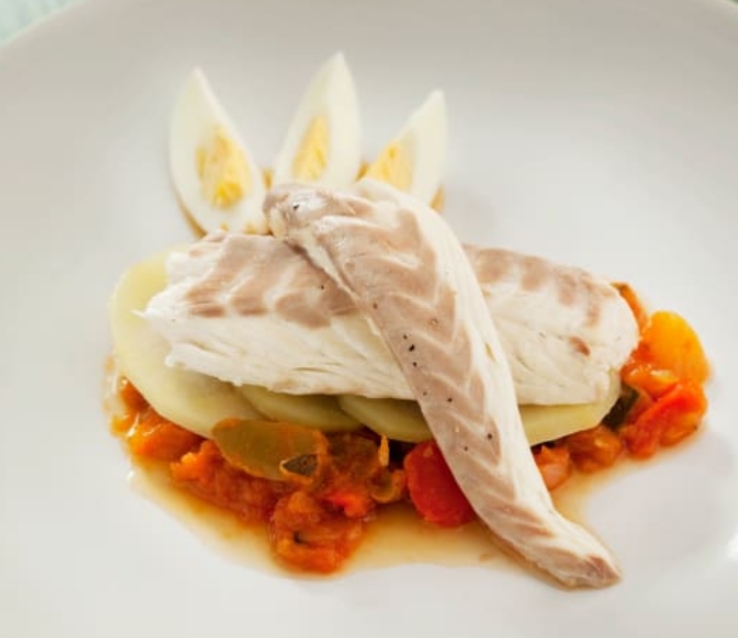 MENÚ COMPLETO:PISTO Y LUBINA CON PATATAS Y HUEVOS.