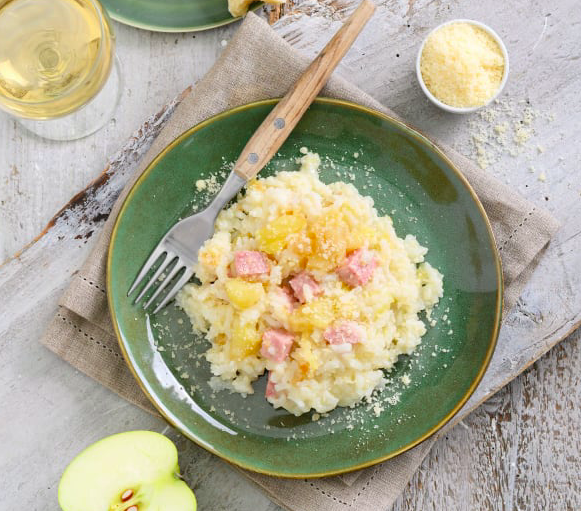 Añada el beicon y 80 g de manzana. Coloque el cestillo sobre la tapa en lugar del cubilete y programe 6 min/100°C/giro a la inversa/vel 1. Vierta el risotto en una fuente para servir, mezcle con la espátula y deje reposar un minuto. Espolvoree el queso parmesano reservado y sirva inmediatamente.