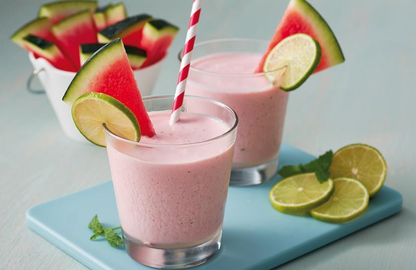 3.- Añada la sandía congelada, la hierbabuena, el zumo de lima, el azúcar y el ron y triture 10 seg/vel 10. Reparta la mezcla en los vasos, decore con la lima, la sandía y sirva.