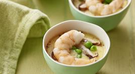 3 . Retire con cuidado la tapa y la bandeja Varoma, retire las hojas de papel de hornear y coloque sobre cada flan láminas de setas shiitake, 1 langostino y 5 guisantes. Vuelva a poner las hojas de papel de hornear sobre los moldes, coloque de nuevo la bandeja Varoma y la tapa del Varoma en su posición y programe otros 10 min/Varoma/vel 1. Sirva caliente.