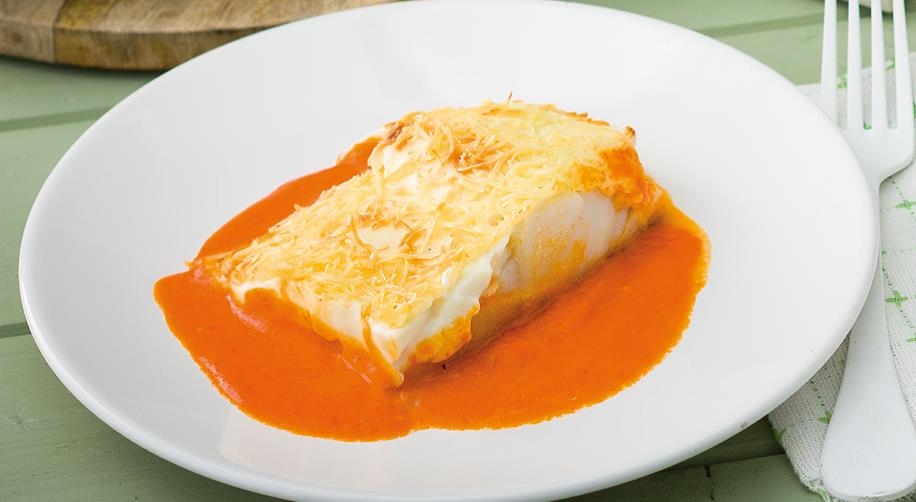 ***BACALAO CON BECHAMEL SOBRE SALSA DE PIMIENTOS (SIN LACTOSA) (Para 6 raciones)***