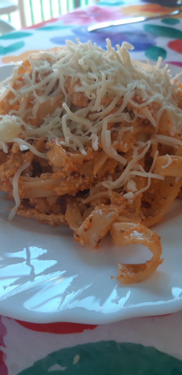 Esta receta es una adaptación de la receta “Pasta integral con salsa de pimientos y almendras” de la Plataforma Cookidoo. Salió riquísima.
