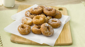 • Con las manos untadas en aceite, forme bolas (aprox. 30 g). Caliente el aceite a fuego medio en una sartén honda. Presione en el centro de cada bola con el dedo para formar las rosquillas, abriéndolas un poco y vaya friéndolas en el aceite caliente. Escúrralas sobre papel de cocina y rebócelas en la fructosa. Deje enfriar y sirva o conserve en un recipiente hermético.
