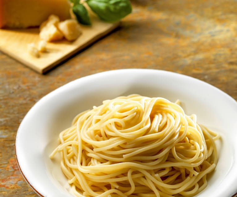 2. Añada la sal y la pasta por la abertura y programe, sin poner el cubilete ni el cestillo, el tiempo que indique el paquete/100°C/Giro Inverso/vel 1, o hasta que esté al dente. Escurra la pasta en el recipiente Varoma y sirva caliente, sola o con alguna salsa.