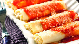 10.- Rellene los canelones y colóquelos en una fuente de horno. Vierta la salsa de tomate por encima, espolvoree con el queso parmesano y gratine durante unos 5-10 minutos (200ºC) o hasta que estén dorados. Sirva inmediatamente.