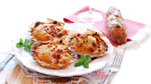 - • Coloque en la bandeja de horno las vieiras cada una en su concha, reparta la cebolla caramelizada encima y espolvoree con el pan rallado.