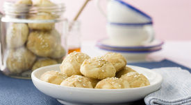 5.- Hornee cada bandeja durante 25 minutos (180ºC). Retire del horno y pincele la superficie con miel. Espolvoree con unas semillas de sésamo. Hornee durante 2 minutos más (180ºC). Retire del horno, deje templar (aprox. 10 minutos) y sirva o conserve en un recipiente hermético.