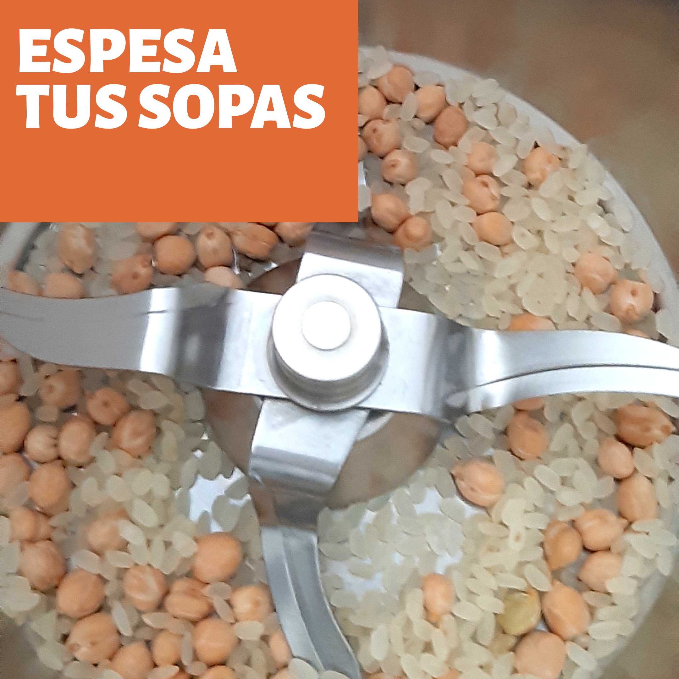 Lo único que tienes que hacer es poner en tu vaso un puñadito de garbanzos y otro de arroz, triturar durante 10 seg/vel 10. Continúa con la receta de sopa que quieras hacer y listo.