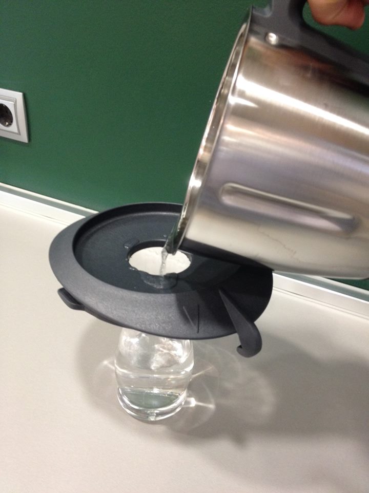 Hay veces que al verter el contenido de nuestro vaso en un recipiente cuya boca es estrecha, se nos derrama parte del contenido fuera del recipiente. Pues bien, si ponemos la tapa de nuestro vaso sobre el recipiente, podemos echar sin miedo nuestra preparación.