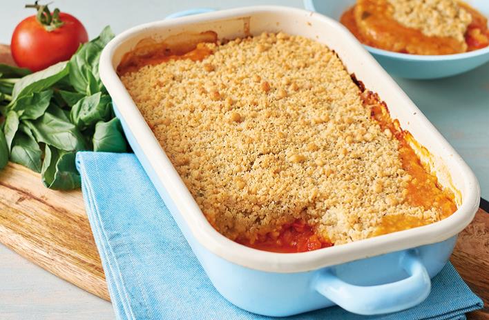 6.- Distribuya el crumble sobre la preparación de tomates y albahaca.