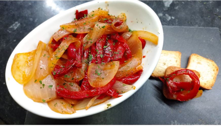 Cebolla y pimientos dorados, preparado con el modo de alta temperatura con el TM6.