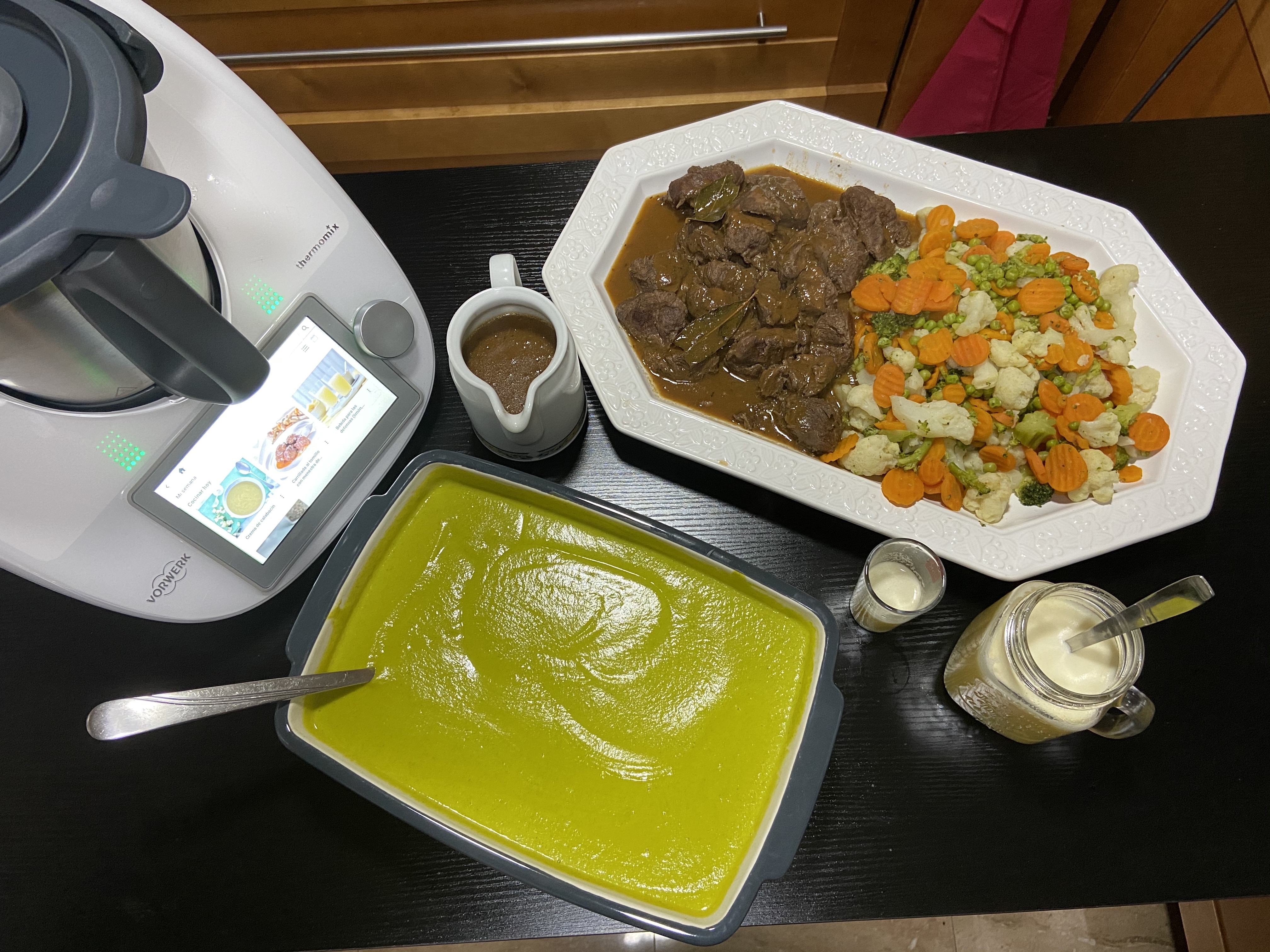 Menu completo de clase de cocina crema y carrilladas al tomillo con menestra con thermomix