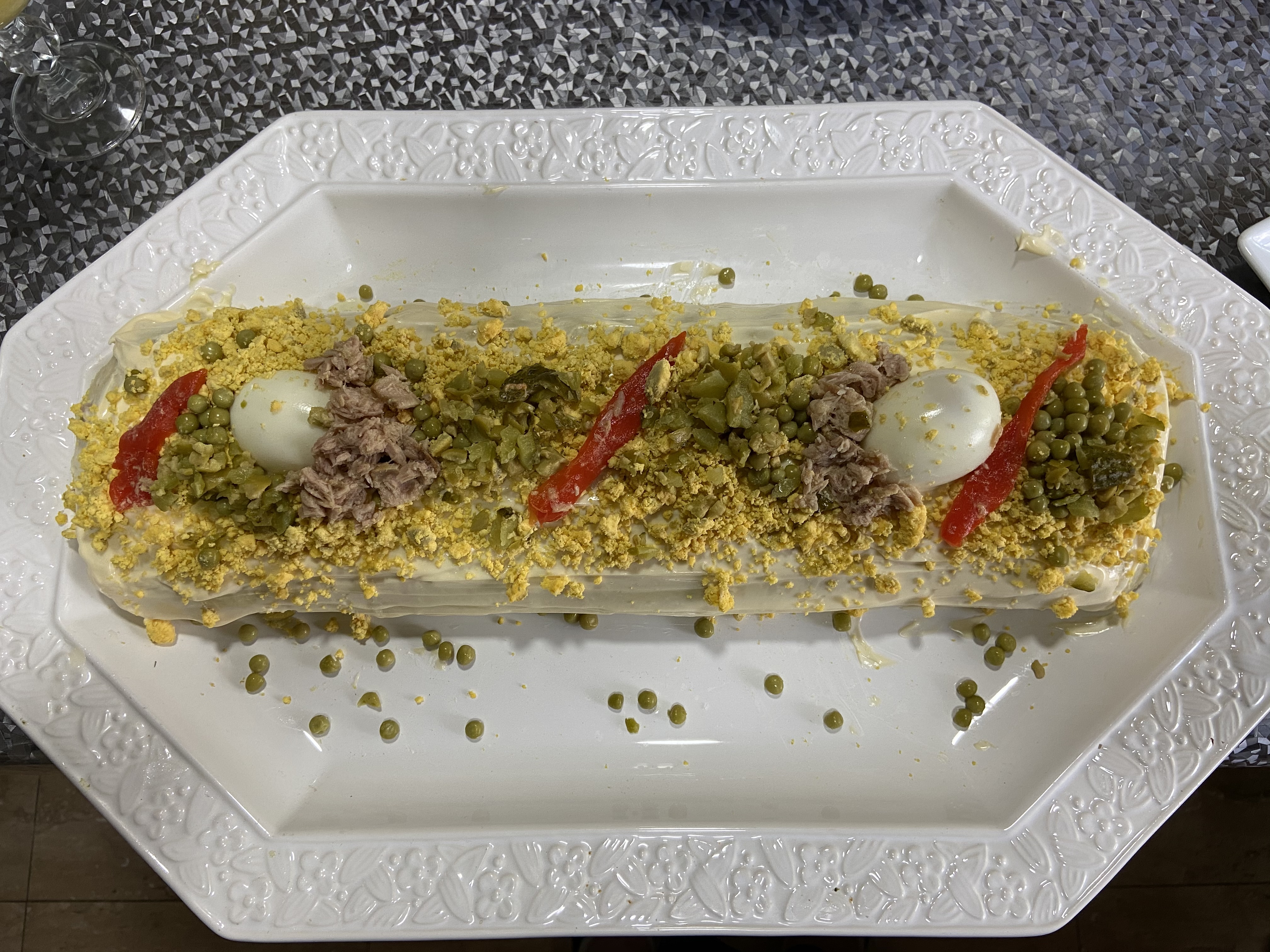 - * Ponga una capa de mayonesa sobre el puré. Dejando uno de los extremos libre (una franja de aprox. 4 cm) para cerrar el rollo, distribuya por toda la superficie, formando tiras longitudinales, las aceitunas y pepinillos reservados, las claras de huevo cocido en trozos, el pimiento morrón, los guisantes y el atún desmenuzado (reserve una cucharada de cada ingrediente para decorar).