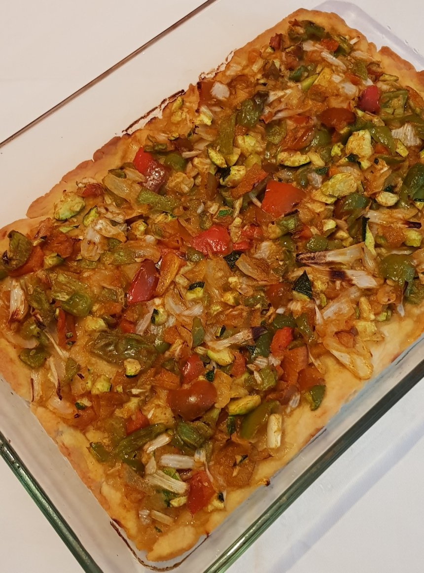 - * Ponga en el vaso el pimiento rojo y el verde, la cebolla, el calabacín, el aceite, la sal y el pimentón. Trocee 3 seg/vel 4. Cubra la masa con las verduras y hornee (200ºC) durante 20 minutos aproximadamente. Sirva caliente o fría.