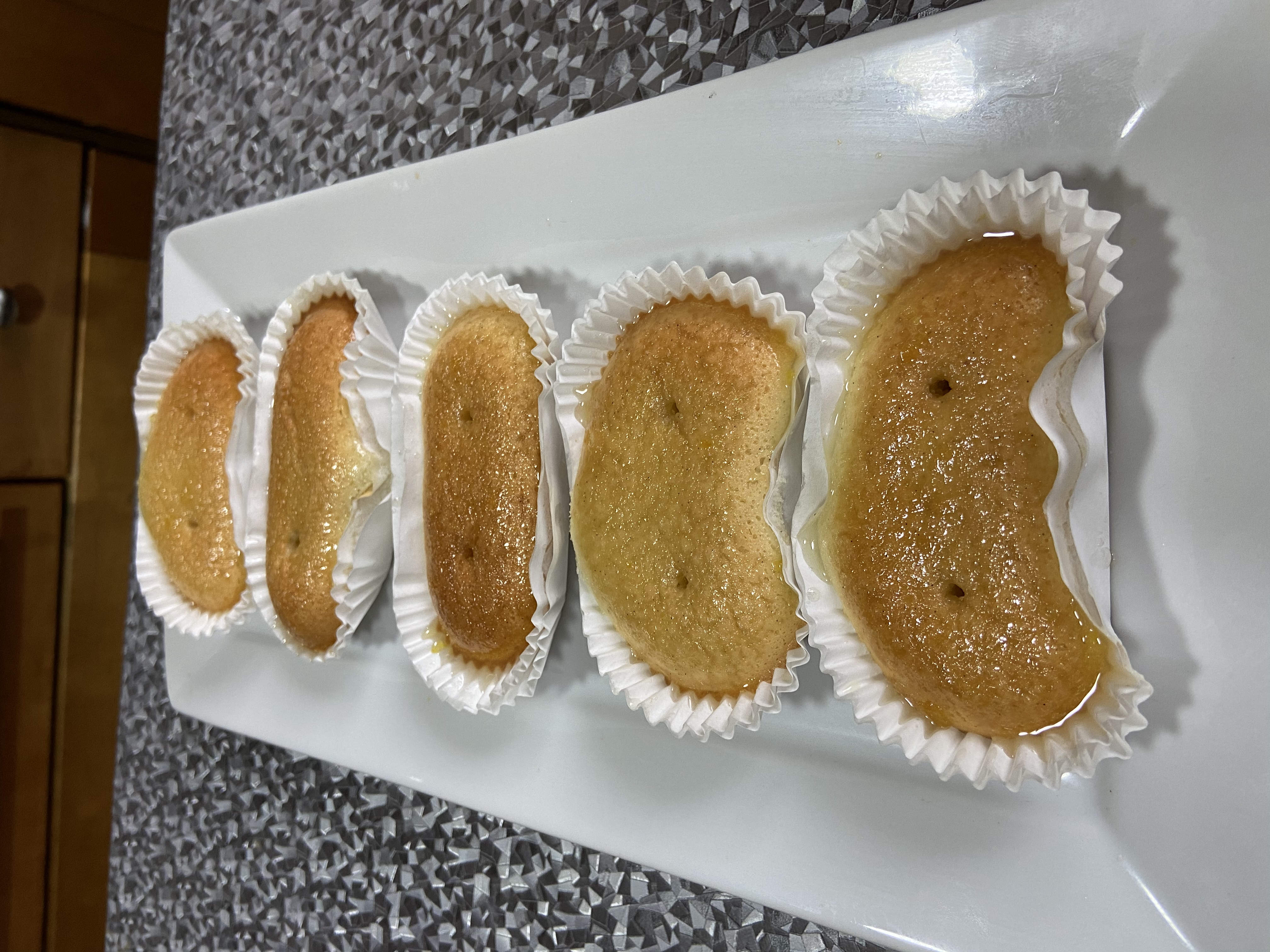 - * Hornee durante 20-25 minutos (180°C). Retire del horno y con una brocheta de madera, pinche los financieros. Riegue con 1-2 cucharaditas de almíbar y espere a que lo absorban (repita hasta terminar con el almíbar). Deje enfriar antes de servir.