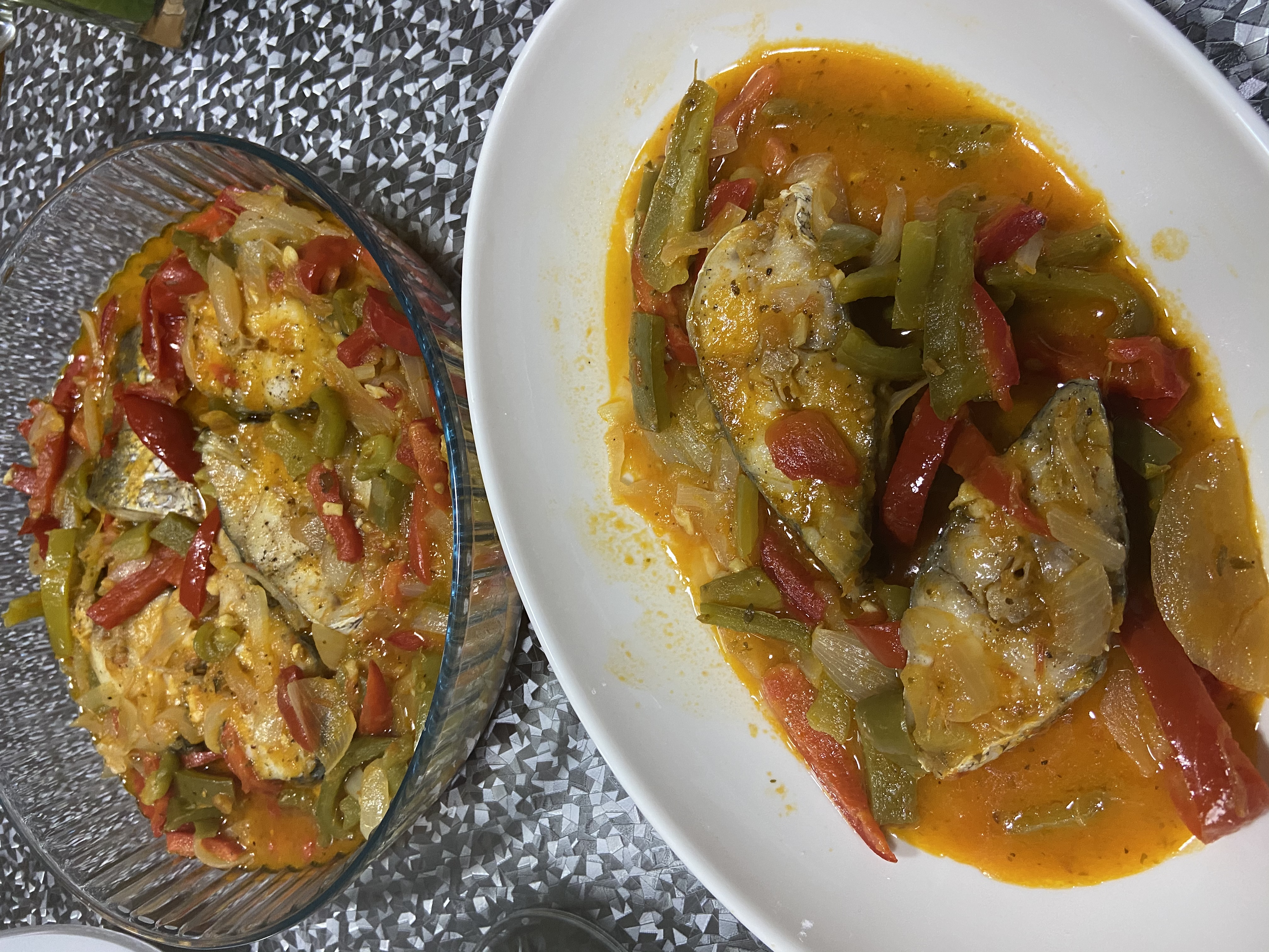 - * 1 corvina (aprox. 1300 g) cortada en rodajas