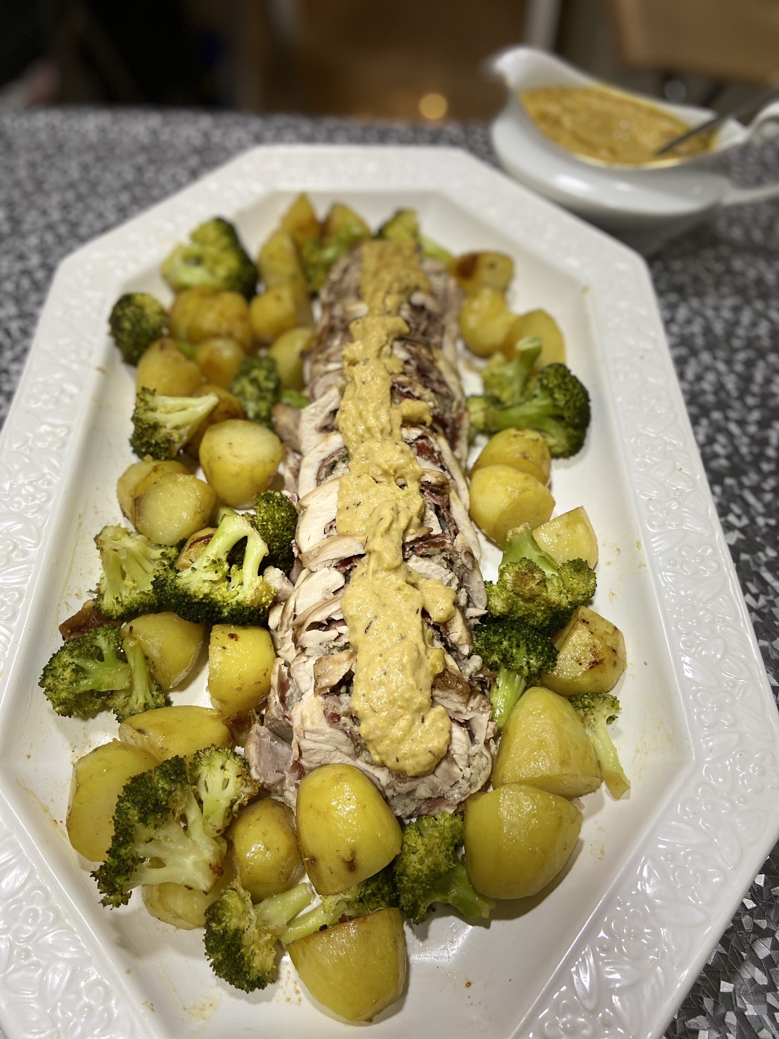 Pollo relleno de champiñones con patatas glaseadas