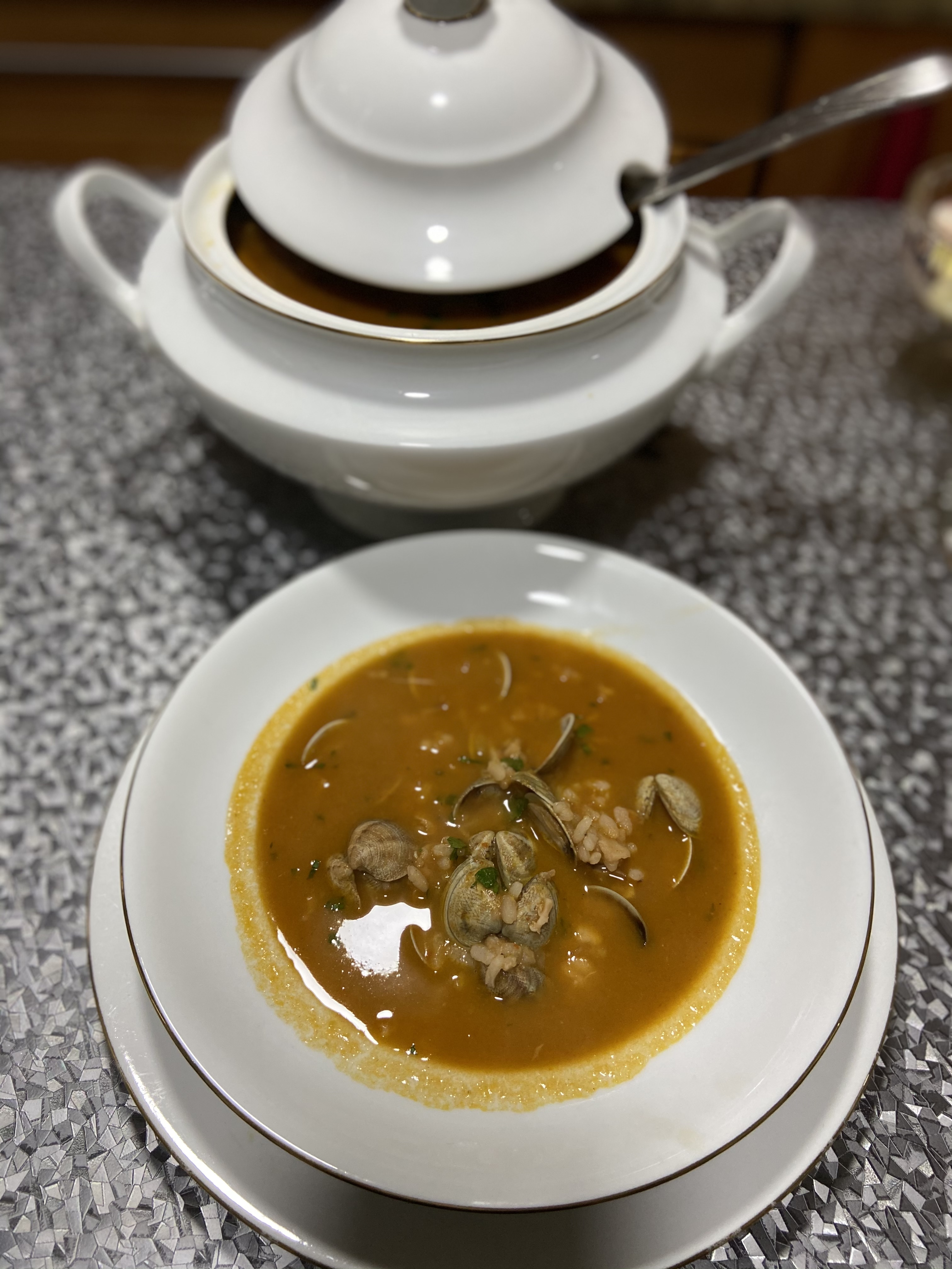 - * Retire el Varoma y añada al vaso los cuerpos de las gambas. Ponga en una sopera las chirlas y la merluza en trozos. Vierta la sopa, espolvoree con el perejil picado y sirva.