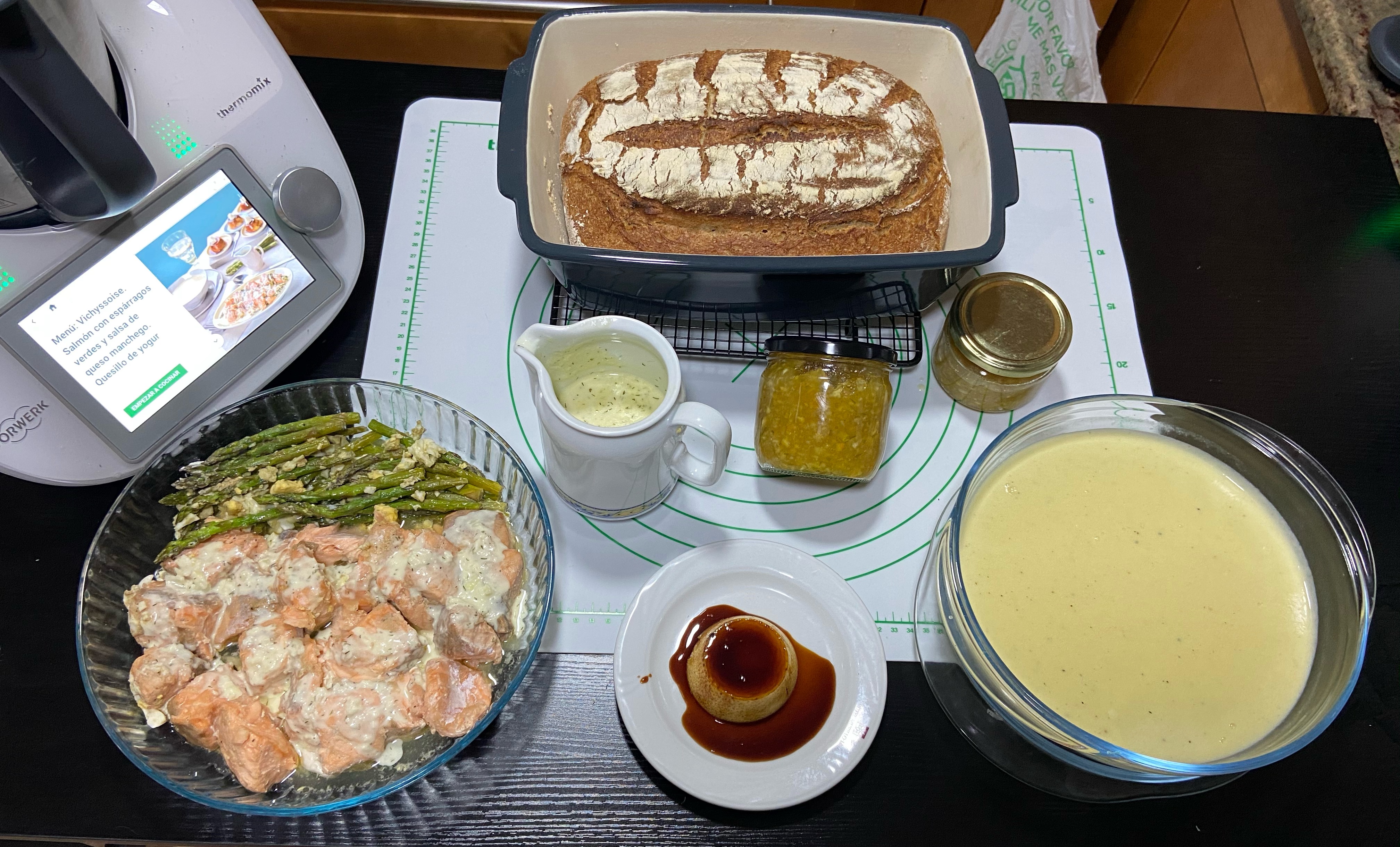 Menú: Vichyssoise. Salmón con espárragos verdes y salsa de queso manchego. Quesillo de yogur