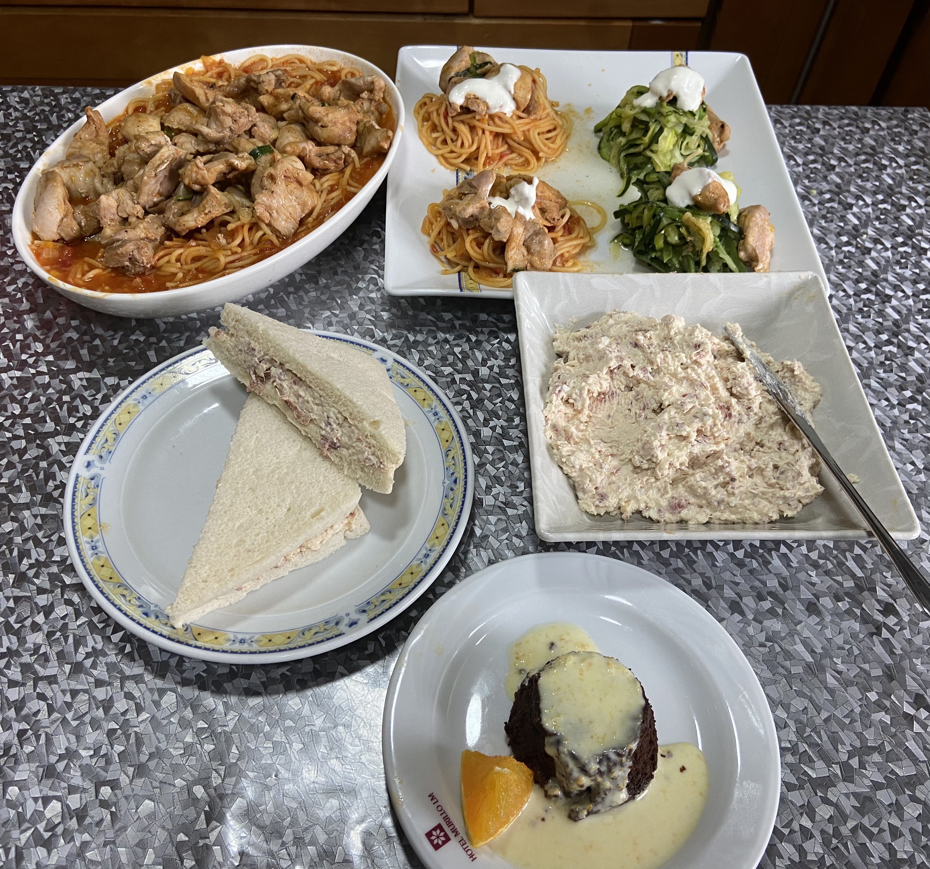 - * Ponga el pollo y los zoodles en una fuente y añada 2-3 cucharaditas de yogur reservado. Vierta los espaguetis en un bol. Sirva el dip de huevo y jamón acompañado de crudités, en tostadas, etc. Desmolde pasando un cuchillo entre el volcán y el molde y sirva regados con la salsa de naranja y gajos de naranja