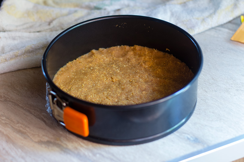 Cubrimos con ésta preparación el fondo de un molde redondo desmontable, de 20 cm de diámetro aprox., presionando con el dorso de una cuchara para que quede compacta. Reserve en el congelador mientras preparamos el relleno. Lavamos el vaso.