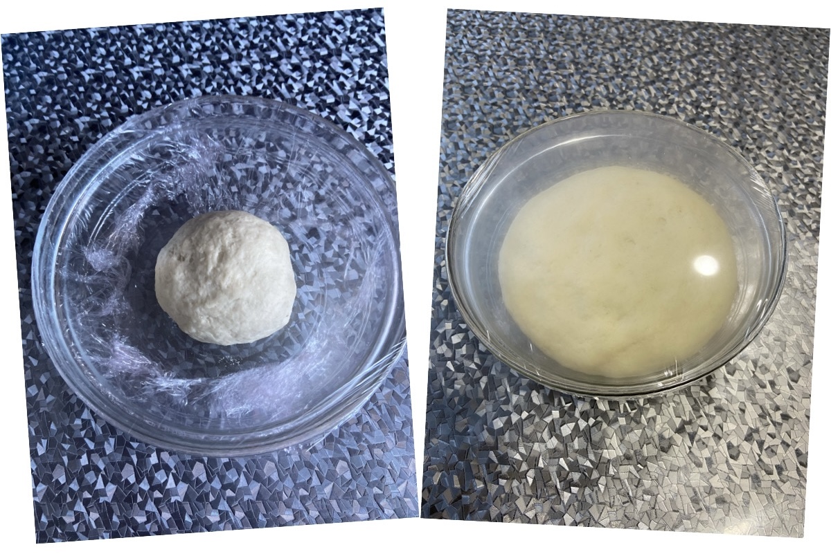 - Retiramos del vaso, le damos forma de bola, introducimos ésta en un bol, cubrimos con film transparente, tapamos el bol con un paño y dejamos reposar hasta que doble su volumen, (aprox.1 hora)