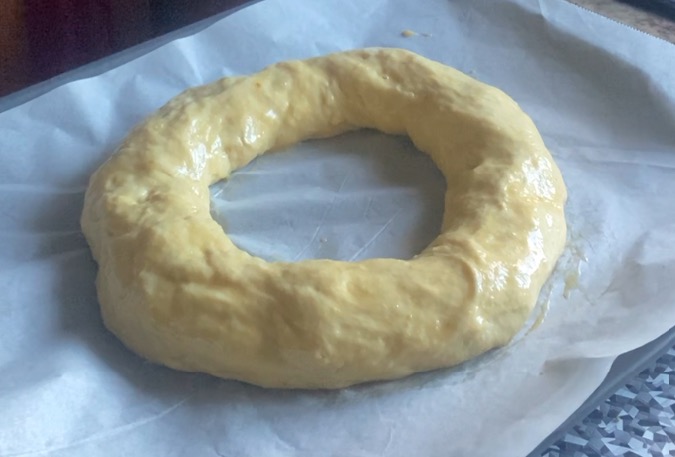 - Para formar el roscón, introducimos los dedos en el centro y abrimos un agujero, al cual iremos dando forma, sujetando con la mano y dejando con su peso se vaya ampliando éste hasta que sea bastante grande ya que cuando va leudando, éste se cierra un poco.