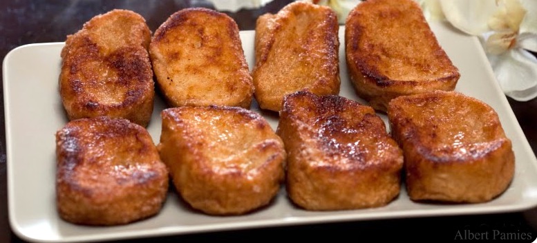11. Cuando acabe el tiempo programado, desenvuelva las torrijas con cuidado y rebócelas en la mezcla de azúcar y canela.