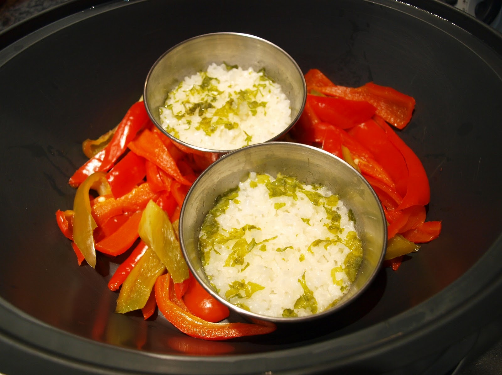 - Pon en el recipiente varoma las dos flanera y pesa en cada una 30 gramos de arroz y 50 g de agua, salpimienta al gusto y añade en los lados el pimientos cortado en tiras. Tapa el varoma y reserva.