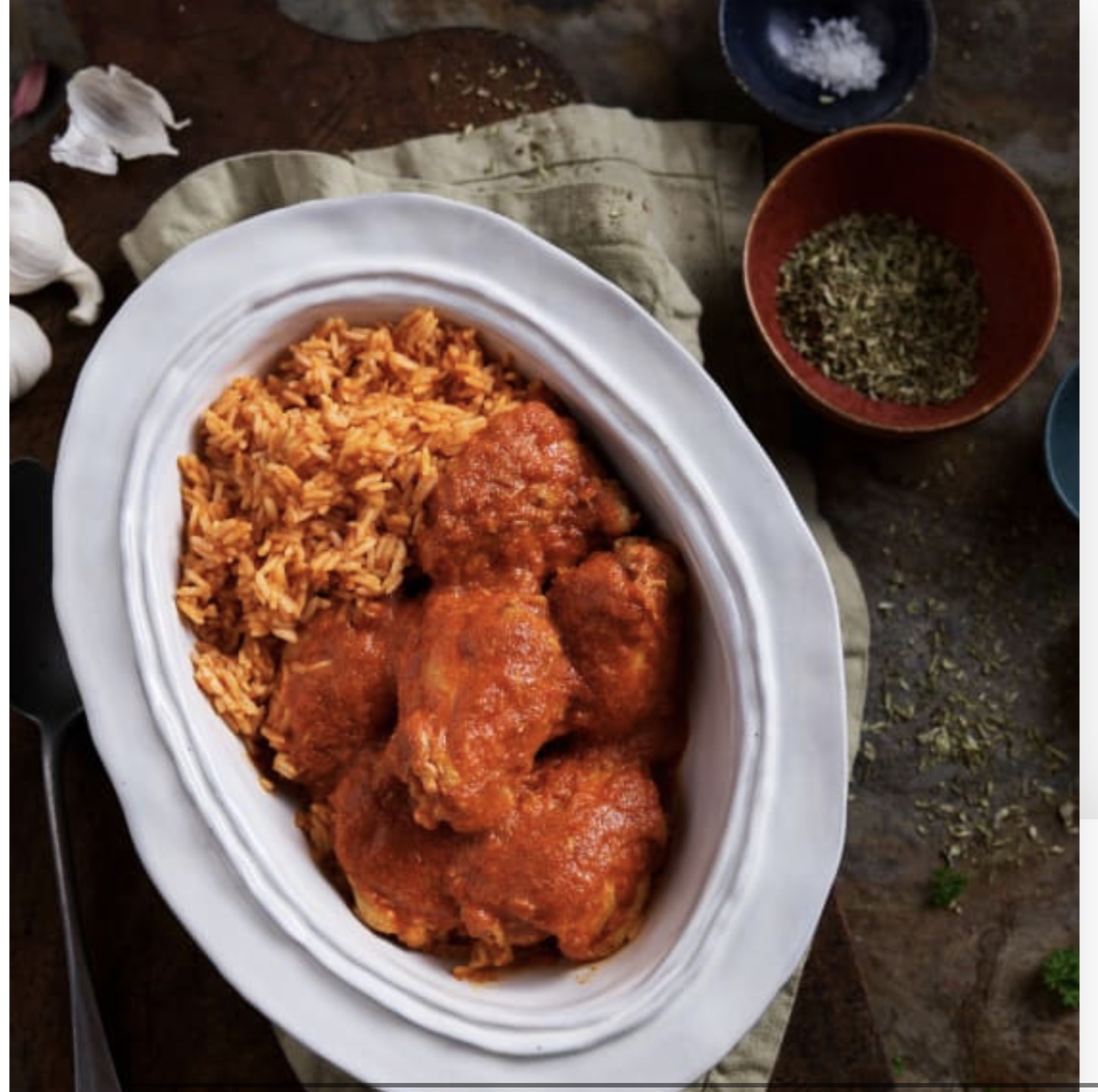 Contras muslos de pollo en salsa de pimiento rojo con arroz