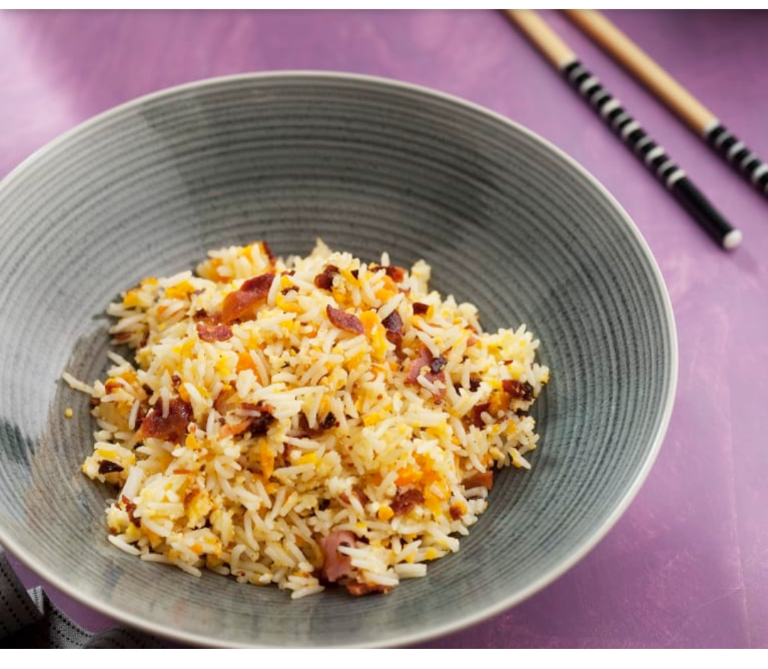 8. Retire el cestillo y vierta el arroz sobre los ingredientes reservados. Añada el beicon troceado, mezcle suavemente con la espátula y sirva caliente.