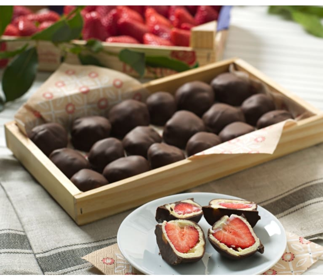 Ponga en el vaso la leche condensada y la leche en polvo y mezcle 15 seg/vel 4. Retire la masa del vaso y divida en 20 porciones. Deles forma de bola, aplástelas con la palma de la mano y envuelva con ellas las fresas reservadas. Deje secar sobre papel de hornear durante 5 minutos. Lave y seque perfectamente el vaso y la tapa.