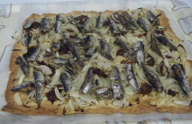 COCA DE CEBOLLA, TOMATE SECO Y SARDINILLAS :