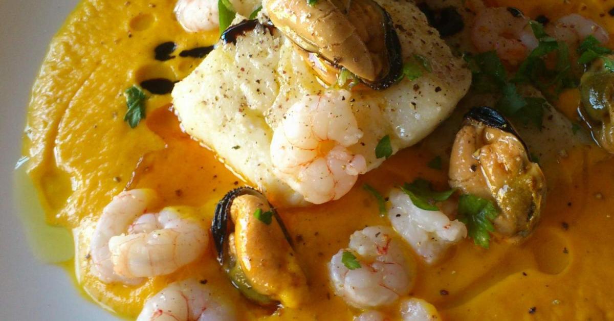 Verter la crema de zanahoria en la base de los platos y colocamos los lomos de bacalao sobre esta, las gambitas peladas y los mejillones.