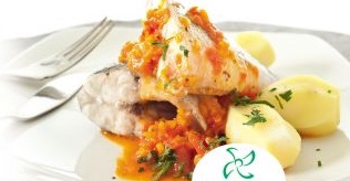 Lubina y patatas al vapor con salsa de verduras rojas.