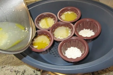 -Colocar en el fondo del varoma, 6 flaneras de silicona o desechables de albal y dentro 30 grs de arroz en cada una