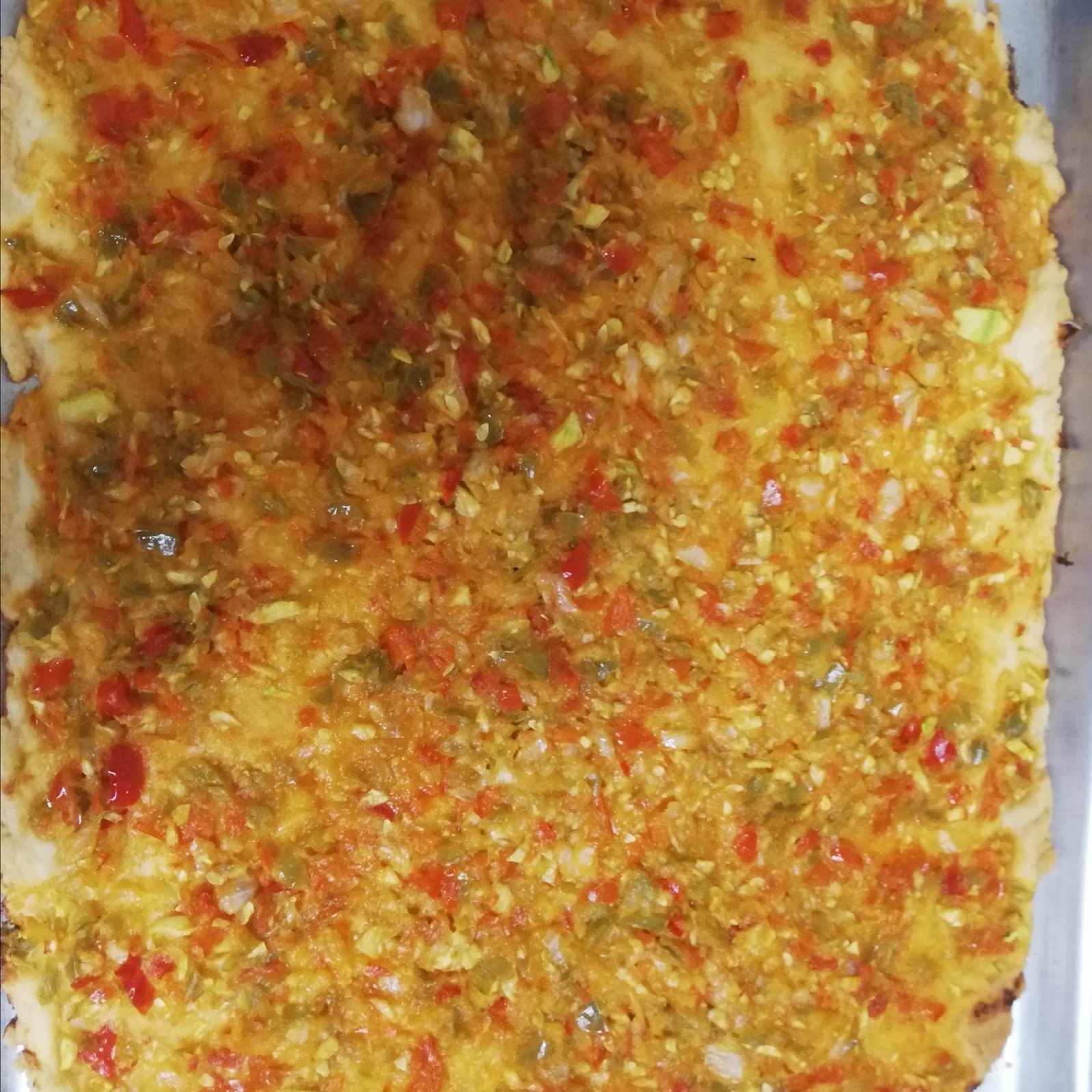 -Ponga en el vaso el pimiento rojo y el verde, la cebolla, el calabacín, el aceite, la sal y el pimentón. Trocee 3 seg/vel 4. Cubra la masa con las verduras y hornee (200ºC) durante 20 minutos aproximadamente. Sirva caliente o fría.