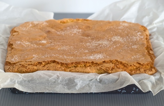 5. Prepara un molde para horno rectangular con papel vegetal un poco engrasado. Vierte la mezcla de la Bica y dale unos golpes para que la masa ocupe bien todo el molde. Espolvorea la superficie con abundante azúcar blanquilla y hornea durante 50-55 minutos a 160ºC. Vigila los últimos 10 minutos para que no se te pase.