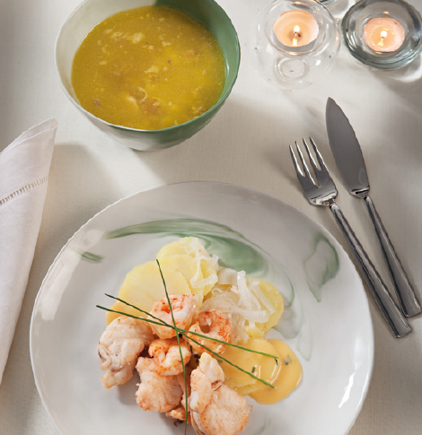 19. Sirva la sopa como primer plato y el salmón con el gambón, la salsa y las patatas como plato principal.