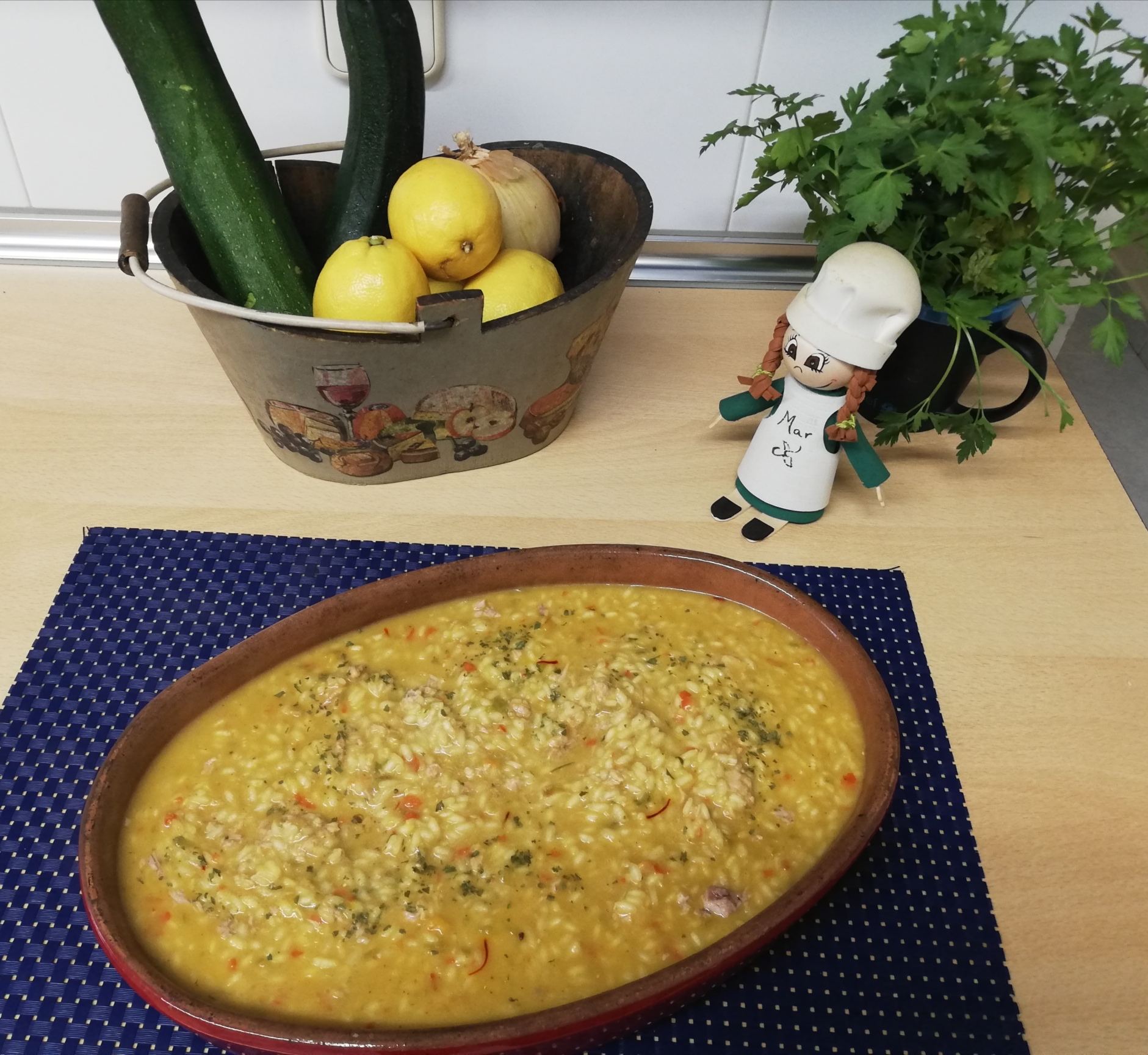 Agregue el colorante, el agua y la pastilla de caldo. Programe 10 min/100°C/giro inverso/vel 1. Vierta en una fuente, añada el atún y mezcle con la espátula. Espolvoree con el perejil picado y sirva.