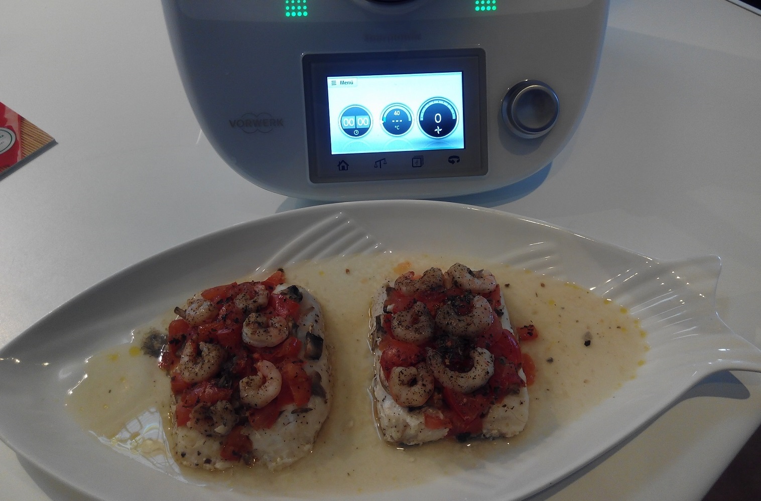 • Corte cuadrados de papel de aluminio y coloque los lomos de mero en el centro de cada uno. Distribuya encima de cada uno los champiñones, el ajo picado, los tomates, la albahaca y las gambas. Riegue con el aceite de oliva y espolvoréelos con sal y pimienta. Cierre bien los papillotes y coloque dos en el recipiente y dos en la badeja varoma.