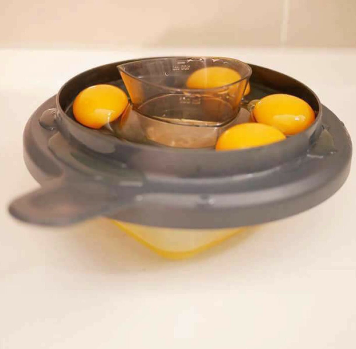 Voy cascando los huevos, sobre ella, y la clara cae al cuenco y las yemas se quedan en la tapa.(Si es necesario movemos un poquito el cubilete, para ayudar a que caiga)