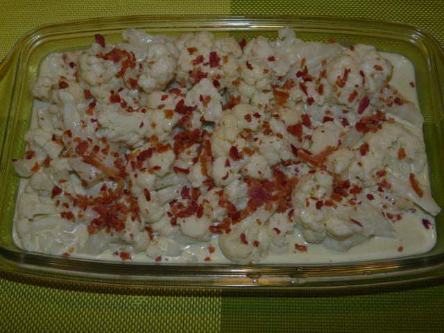 6-En una fuente ponemos la coliflor. Vertemos por encima la salsa de gorgonzola. Finalmente espolvoreamos con el bacón picado.