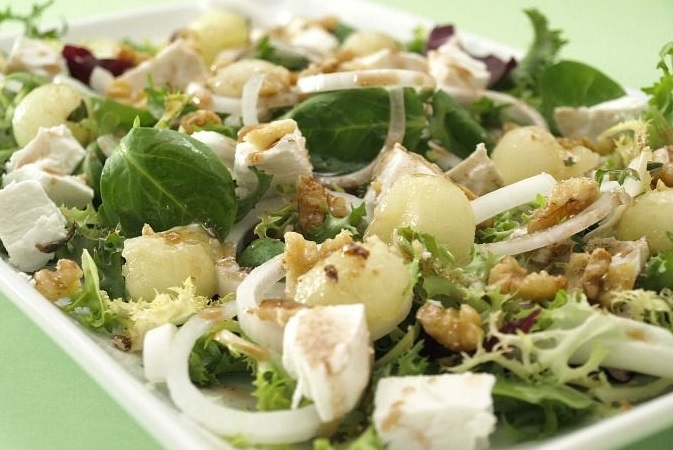 Ensalada de melón y queso de cabra con vinagreta de hierbabuena .