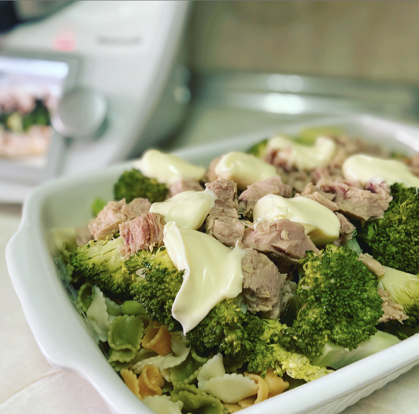 Retire el Varoma, cuele la pasta y viértala en una fuente honda. Añada el brócoli, el atún y la mayonesa y sirva.